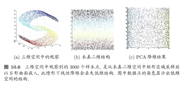 线性降维方法假设从高维空间到低维空间的函数映射是线性的,然而,在不少现实任务中,可能需要非线性映射才能找到恰当的低维嵌入,图10.6给出了一个例子,样本点从二维空间中的矩形区域采样后以S形曲面嵌入到三维空间,若直接使用线性降维方法对三维空间观察到的样本点进行降维,则将丢失原本的低维结构,为了对“原本采样的”低维空间与降维后的低维空间加以区别,我们称前者为“本真”(intrinsic)低维空间。