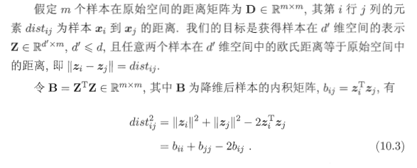 不管是使用核函数升维还是对数据降维,我们都希望原始空间样本点之间的距离在新空间中基本保持不变,这样才不会使得原始空间样本之间的关系及总体分布发生较大的改变。**“多维缩放”(Multiple Dimensional Scaling,MDS)**正是基于这样的思想,MDS要求原始空间样本之间的距离在降维后的低维空间中得以保持。