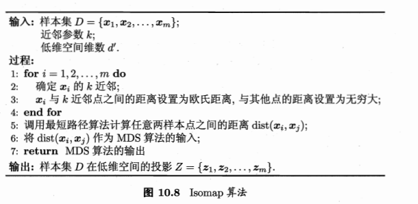 利用流形在局部上与欧式空间同胚的性质,可以使用近邻距离来逼近测地线距离**,即对于一个样本点,它与近邻内的样本点之间是可达的,且距离使用欧式距离计算,这样整个样本空间就形成了一张近邻图,高维空间中两个样本之间的距离就转为最短路径问题。可采用著名的Dijkstra算法或Floyd算法计算最短距离,得到高维空间中任意两点之间的距离后便可以使用MDS算法来其计算低维空间中的坐标。