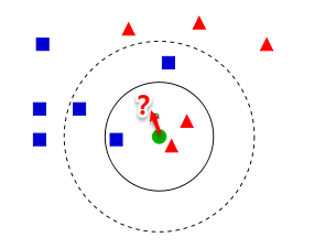 从上图中我们可以看到,图中有两种类型的样本,一类是蓝色正方形,另一类是红色三角形。而那个绿色圆形是我们待分类的样本。基于kNN算法的思路,我们很容易得到以下结论: