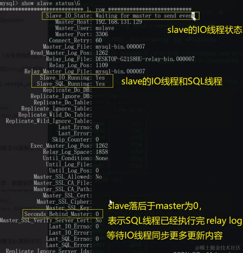 mysql> start slave;可以通过show slave status查看以下标识,IO线程出错一般是网络问题,SQL线程出错一般是SQL在slave库执行出现了问题