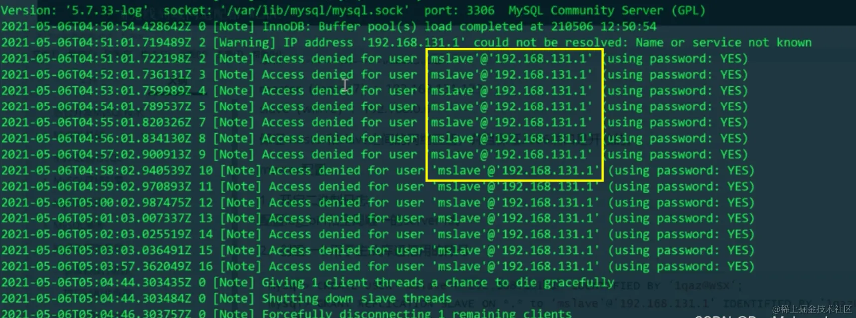 如果给slave配置的不是网关192.168.131.1地址,错误日志(可在my.cnf中指定)中会有如下信息: