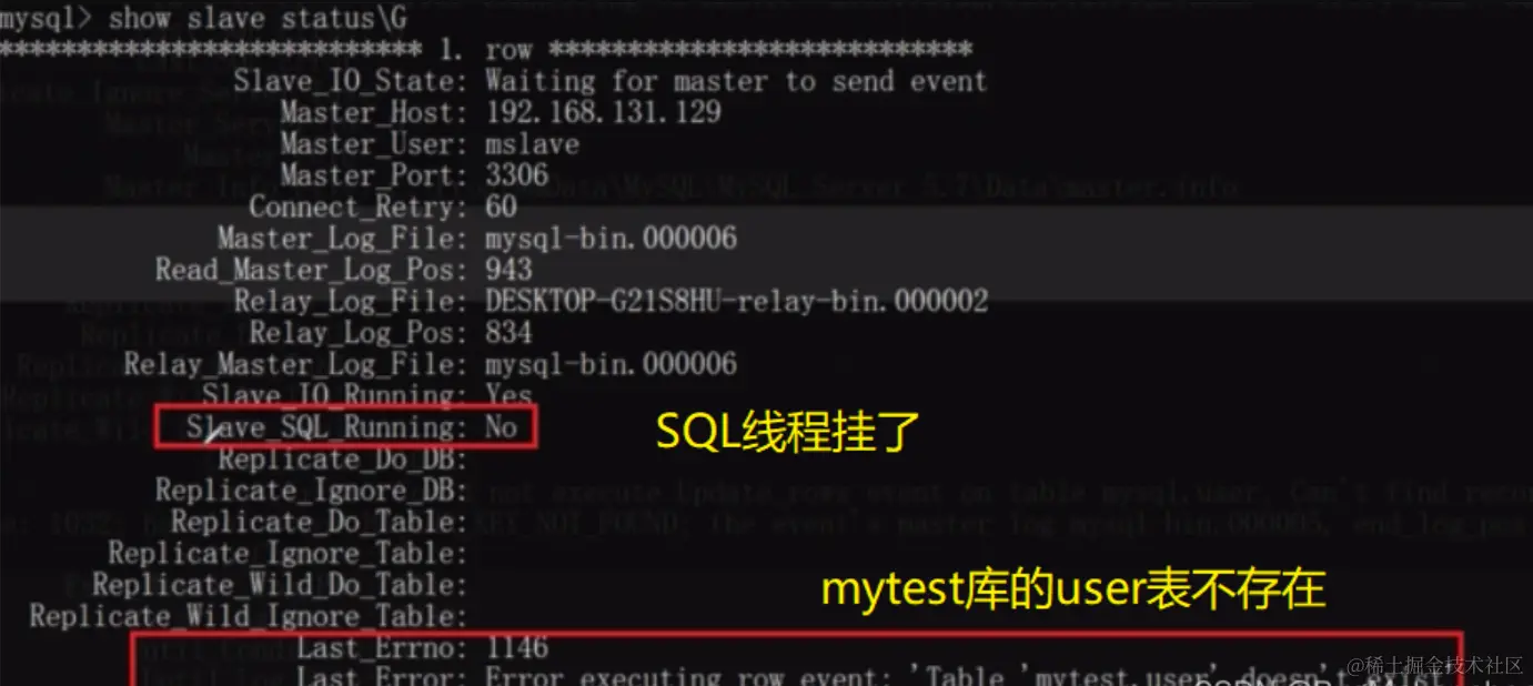 配置好主从复制后直接drop table mytest.user,这就会写到binlog里面,然后在通过dump线程和IO线程将这个操作发送到从库的relay log,然后从库的SQL线程从relay log里把drop table mytest.user捞出来在从库执行这个SQL,可从库的mytest根本就没有user表,这就是删除一个不存在的表,于是出现错误了