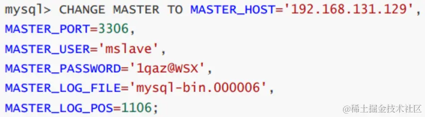 mysql> CHANGE MASTER TO MASTER_HOST='192.168.131.129',MASTER_PORT=3306,MASTER_USER='mslave',MASTER_PASSWORD='1qaz@WSX',