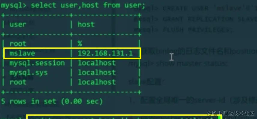 mysql> GRANT REPLICATION SLAVE ON *.* to 'mslave'@'192.168.131.1' IDENTIFIED BY '14ds@EGBFV'; -- 给mslave用户主从同步的权限(REPLICATION SLAVE)