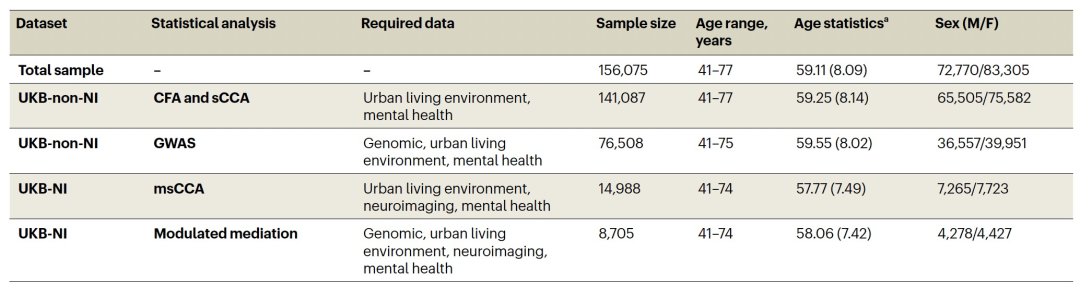 作者的分析针对来自英国生物库(UK Biobank,UKB)的156,075名成年参与者的子集进行,年龄在41至77岁之间(平均年龄:59.11岁),主要居住在城市地区。这个子集评估了与他们的家庭地址相关联的128个城市生活环境变量和21个精神症状。城市生活环境包括空气和声音污染、交通、绿地接近度、沿海接近度、水源接近度、多重贫困的社会经济指标(IMD)、建筑分类、到达目的地的距离(例如,家庭医生诊所、邮局)、土地利用密度(LD)、地形、标准化差异植被指数(NDVI)(衡量绿化程度的指标)以及街道网络(SN)可达性。来自UKB的参与者,具有完整的城市生活环境变量和精神症状数据,被分为没有神经影像数据(UKB-non-NI)的数据集(n = 141,087)和有神经影像数据(UKB-NI)的数据集(n = 14,988)。在分析时,42,796名参与者进行了大脑神经影像学检查,其中14,988名参与者进行了完整的神经影像学、城市生活环境和精神症状评估。示意概要如图1所示。特定统计分析的人口统计信息如表1所示。