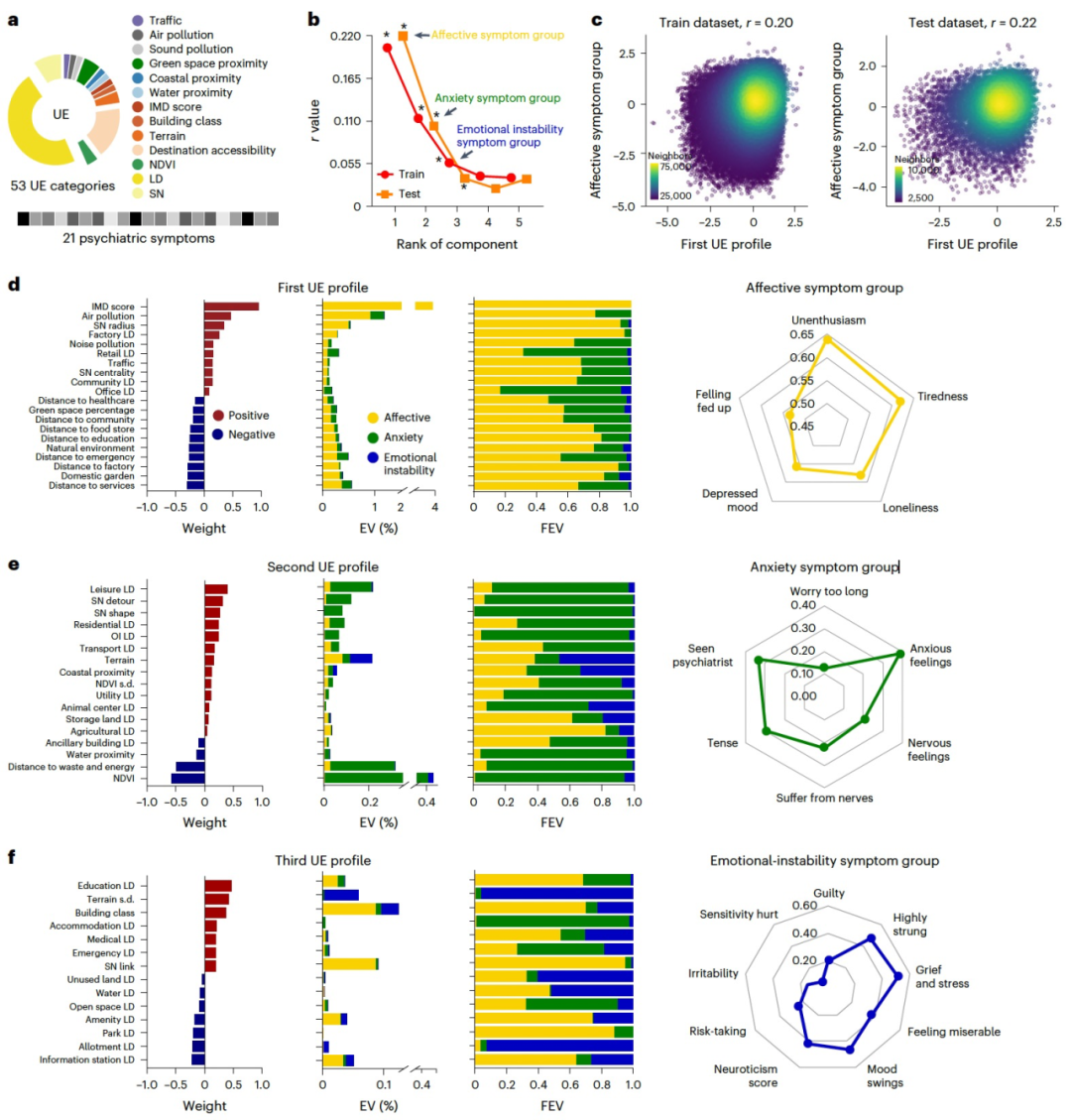 作者在训练数据集中发现了城市生活环境特征与一个包括五种精神症状的群体之间的显著关系,这一关系在测试数据集中也得到了验证(图2b、c)。这个精神症状群包括疲倦的频率、孤独、抑郁情绪的频率和感到厌倦(图2d),作者总结为情感症状群。情感症状群与包括空气和声音污染、街道可达性的测量、交通和城市基础设施在内的环境因素呈正相关。这一群体与城市设施(服务、工厂、紧急情况、教育、食品店、社区和医疗保健)的距离以及绿地的接近度(家庭花园、自然环境和绿地的百分比)呈负相关(图2d)。结果表明,情感症状群与社会贫困和空气污染水平较高的环境特征呈正相关,而与交通和基础设施设施的短距离接近度等因素呈负相关。