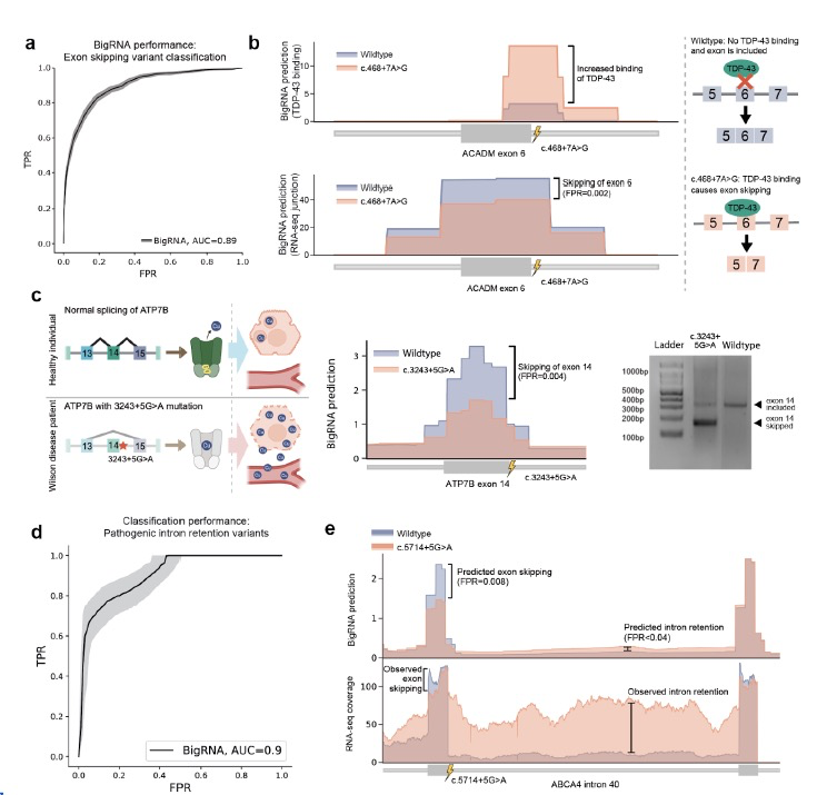 一类重要的病因性变异影响了基因剪接,例如那些导致外显子跳跃的变异。这些变异通常发生在编码区域,并且可能基于其氨基酸替代而被错误地分类为良性突变,尽管它们具有病因性的剪接效应。作者评估了BigRNA对外显子变异的剪接影响的分类能力,这些变异导致大幅度(>50%)的外显子跳跃,与那些不引起任何剪接变化的变异相比,使用了大规模并行剪接分析(MaPSy)的结果。通过预测这些变异引起的连接覆盖变化,BigRNA能够准确地预测这些跳跃变异(AUC = 0.89,图3a),并在这项任务上表现比先前发表的方法SpliceAI 更好(AUC=0.80,差异小于1e-05)。作者进一步研究了一个引起ACADM基因外显子6跳跃的病因性变异,可能导致潜在的中链酰CoA脱氢酶缺乏症。BigRNA预测了这个变异的外显子跳跃效应(FPR = 0.002,图3b),并且它通过创建TDP-43蛋白的结合位点来引起这种跳跃,从而提供了关于作用机制的见解。作者进一步研究了ATP7B中的一个VUS,该基因清除肝细胞中的铜,当其缺陷时会导致威尔逊氏病。BigRNA预测这个变异会导致ATP7B外显子14的跳跃(FPR=0.004,图3c),该外显子包含ATP位点和其他关键元素,因此导致了病因性的功能丧失。