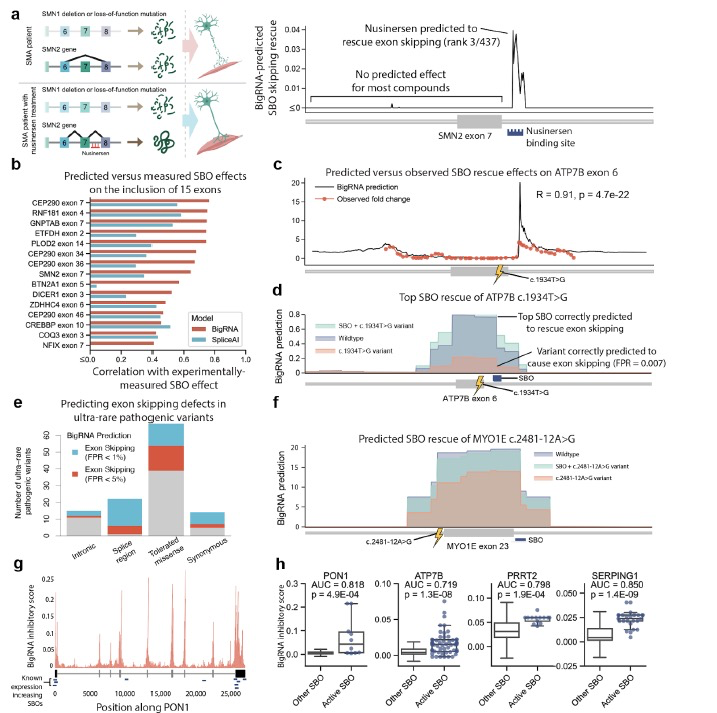BigRNA的能力在理解影响剪接和基因表达的调控机制方面可能使其能够设计治疗干预措施,以挽救致病变异的影响。在这个应用中,作者评估了BigRNA是否能够通过设计靶向特定RNA的短、化学修饰的合成核酸链(称为"steric blocking oligonucleotides"或SBOs)来逆转剪接缺陷,以调控剪接和基因表达。例如,经FDA批准的Nusinersen是一种SBO,通过逆转SMN2基因中的外显子7跳跃,从而恢复SMN蛋白水平,减轻运动神经元损失和肌肉萎缩,治疗脊髓性肌肉萎缩症。预测SBO的效果的一种方法是隐藏模型输入中的互补结合位点。这种方法属于“零样本学习”的一个示例,因为在进行预测时没有使用任何额外的任务特定的SBO数据。为了评估零样本学习在虚拟筛选中的实用性,作者首先评估了BigRNA在SMN2外显子7的200碱基对内重新发现Nusinersen的能力。令人惊讶的是,BigRNA在437个化合物中将Nusinersen排名前三(图4a)。为了更系统地评估这种方法的有效性,作者对12个基因中的15个外显子进行了总共620个SBO的处理,并观察到在所有情况下预测和实验测得的外显子包含水平之间存在强有力且统计学显著的相关性(r=0.41-0.77,p=7e-12到2e-2,图4b)。