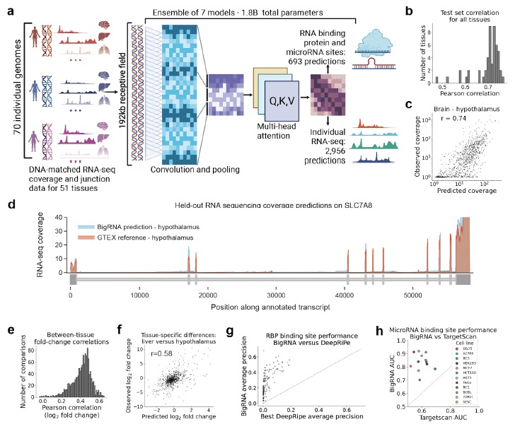 为了训练BigRNA以从相应的DNA序列预测RNA-seq数据,作者采用了基于Transformer的架构,并利用了GTEx资源。对于一个个体的基因型,作者将两个潜在的单倍型独立输入到模型的相同实例中,并训练它以预测这些单倍型的组合输出所观察到的RNA-seq数据(图1a)。模型的每个输出“头”预测一个GTEx样本的表达,因此它学会了预测来自70个个体的2,956个RNA-seq样本在总共51种组织中的输出。在这些RNA-seq数据集上训练后,模型被微调以预测RBP和microRNA结合位点的特异性。作者首先评估了BigRNA预测未见基因组序列表达的能力。作者测量了模型预测训练集之外基因的组织特异性表达水平的能力。BigRNA在预测未见基因的表达水平方面表现出强大的性能,在所有组织中的相关系数(r)在0.47到0.77之间(平均=0.70,图1b)。作者观察到在脑组织中的性能略高于非脑组织(平均r=0.74对0.69,p=5e-03),并强调该模型能够准确预测下丘脑中的表达水平(r=0.74,图1c)。BigRNA预测了SLC7A8的表达水平,这是测试集中的一种氨基酸转运蛋白,展示了预测总体表达水平和准确描绘内外含子结合点的能力(图1d)。为了评估BigRNA在预测不同组织之间的差异这一更困难的任务上的性能,作者使用BigRNA的预测来计算组织对之间总外显子覆盖度的折叠变化,并将其与观察到的折叠变化进行比较。在所有组织间的比较中,观察到平均相关系数r=0.4,这是因为这项任务更加困难(图1e)。作者强调了肝脏和下丘脑之间的比较(r=0.58,p=7e-64,图1f)以说明这一能力。