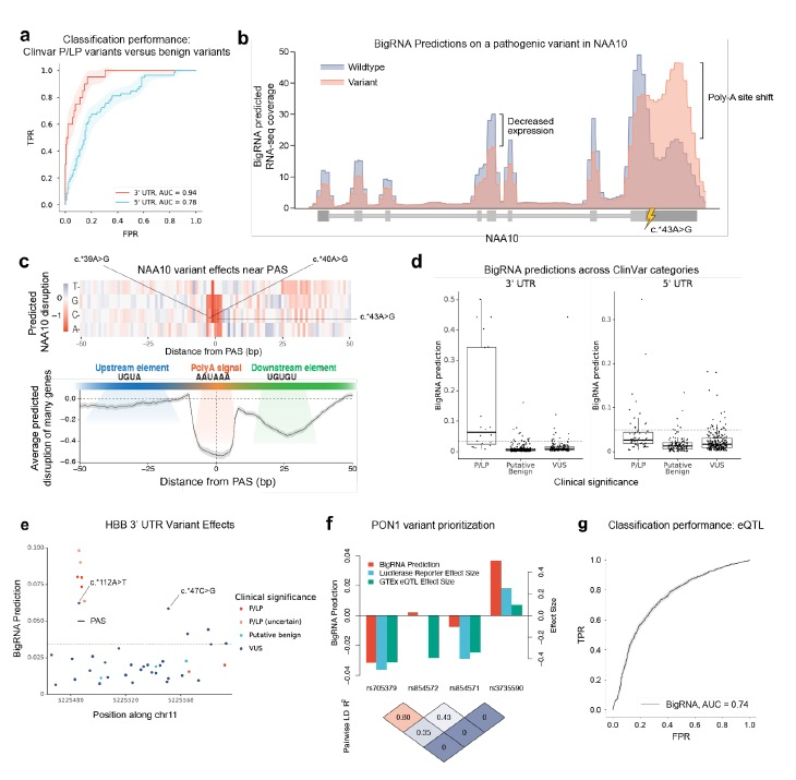 为了填补这一空白,作者评估了BigRNA预测ClinVar中的一组经过筛选的致病性或可能致病性(P/LP)UTR变异的影响能力。作者发现,BigRNA在预测这些变异对其相关疾病基因表达的影响时表现出了强大的性能,无论是在3'UTR还是5'UTR中(AUC=0.95和0.8,图2a)。在5'UTR中的较弱性能可能是由于P/LP变异中调节RNA表达的比例较小,以及影响翻译的机制比例较大(29/47)。作者进一步研究了3'UTR中已知的致病性表达降低变异NAA10。这个变异已知会导致X连锁性显性小眼综合症,并通过破坏NAA10转录物的多腺苷酸化位点(PAS)来降低表达。BigRNA的预测突出了这个变异的表达降低效应(假阳性率FPR <0.5%),并预测了在患者RNA-seq样本中观察到的3'UTR的延长效应(图2b)。对这个变异附近的体外饱和突变分析突出了PAS的重要性,并确认了其他两个附近的P/LP变异的影响(图2c)。
