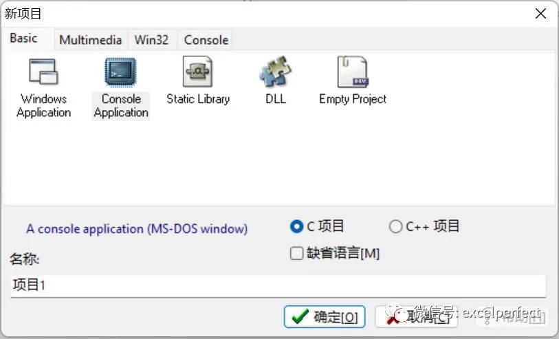 在出现的“新项目”窗口中选择“Console Application”,选取“C项目”,单击“确定”按钮,如下图6所示。