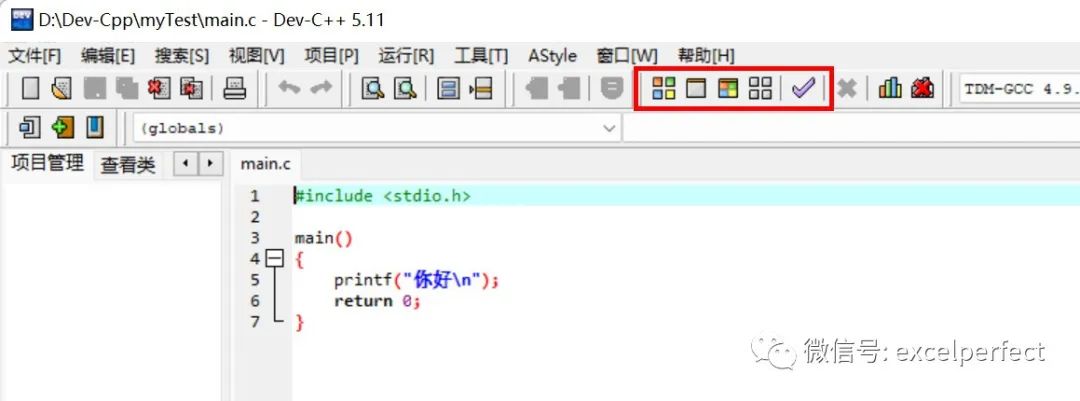 输入自己的程序代码,然后编译、运行程序。编译运行工具按钮如下图8中红色框中所示。