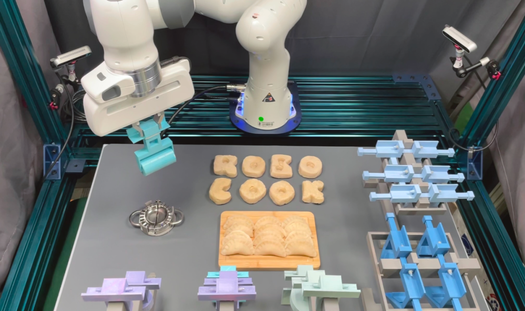 该研究表明,对于每个工具,仅需 20 分钟的现实世界交互数据,RoboCook 就能学会并操纵机械臂完成一些复杂的、长时程的弹塑性物体操作任务,例如制作饺子、字母饼干等。