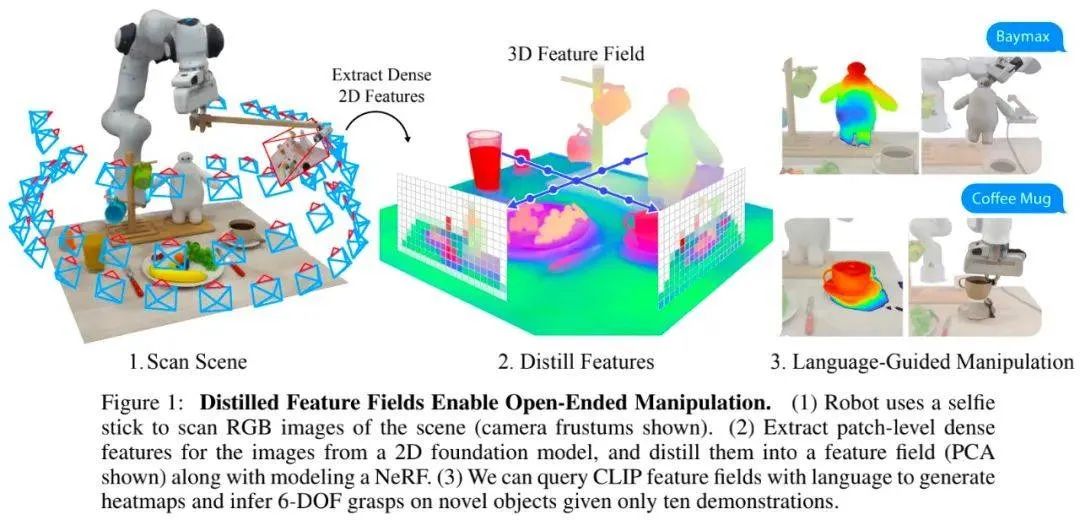 该研究利用蒸馏特征场(Distilled Feature Field,DFF),将准确的 3D 几何图形与来自 2D 基础模型的丰富语义结合起来,让机器人能够利用 2D 基础模型中丰富的视觉和语言先验,完成语言指导的操作。