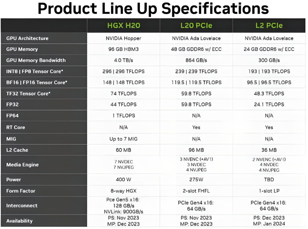 L20 和 L2 是分别配备 48 GB 和 24 GB GDDR6 的 PCIe 卡,内存带宽分别为 864 GB/s 和 300 GB/s。它们的 GPU 核心型号是 AD102,公布的性能数据如下: