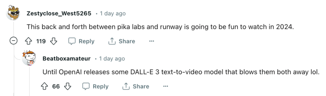 对于这种疯狂卷的态势,一部分用户是非常期待的:「2024 年,Pika Labs 和 Runway 之间的拉扯一定很有意思。」