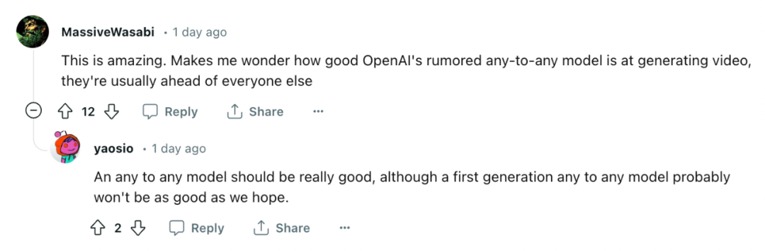 传闻中,OpenAI 也有视频生成相关的技术。有网友表示:「这让我不禁好奇,OpenAI 的 any-to-any 模型在生成视频方面究竟有多出色,因为这家公司通常都走在别人前面。」