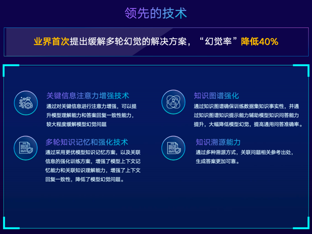 让人最为关注的是,中国电信千亿参数星辰语义大模型在业界首次提出了缓解多轮幻觉的解决方案,将模型幻觉率降低了 40%。这一方案包括四项关键技术: