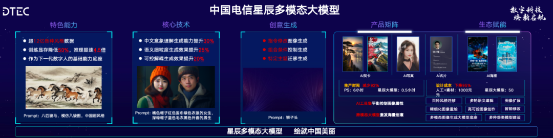 在这场论坛中,中国电信隆重介绍了星辰多模态大模型,该模型主要聚焦提升图文生成、图文理解能力,训练了超过 12 亿各种风格数据,支持近 20 种绘画风格,中文意象理解生成能力提升 30%,语义细粒度生成效果提升 25%。