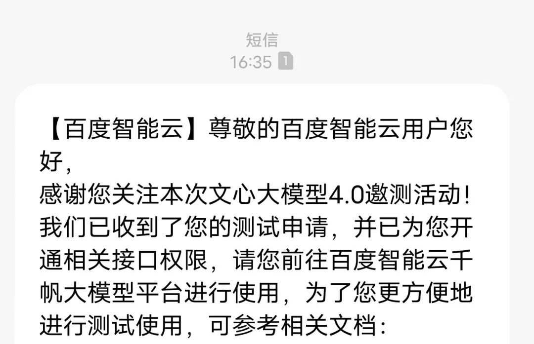 [百度智能云]尊敬的百度智能云用户您好感谢您关注本次文心大模型4.0邀测活动!我们已收到了您的测试申请,并已为您开通相关接口权限。