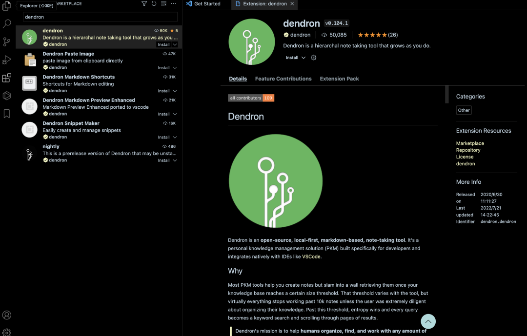 Dendron 是一个开源的、笔记可本地化的、基于 Markdown 语法记录的笔记软件,可以与 VSCode 等 IDE 原生集成,非常适合开发人员构建自己的个人知识体系!