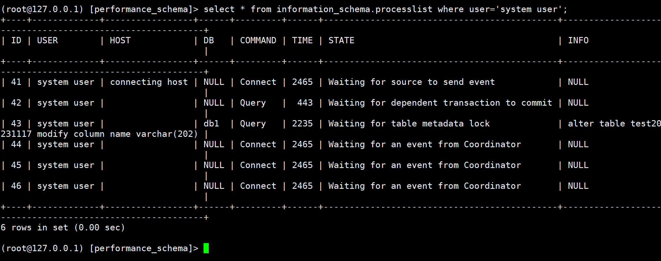 select * from information_schema.processlist where user='system user';