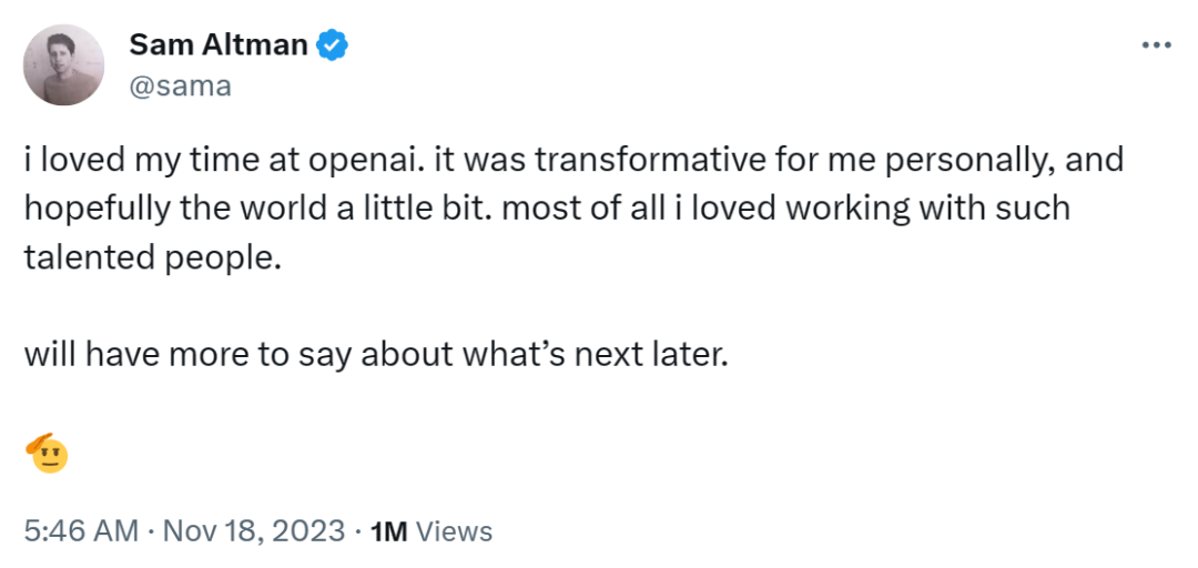 对此,Sam Altman 在推特上回应:「我热爱在 OpenAI 的这段时光,它改变了我,也希望它能改变世界。最重要的是我曾和众多才华横溢的人一起工作。关于下一步的打算,我晚些会有更多解释。」