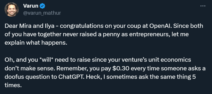 亲爱的 Mira 和 Ilya,恭喜你们在 OpenAI 的政变取得成功。考虑到你们俩从来没有作为企业家筹集过一分钱,让我来解释一下接下来将发生什么。 哦,你们将需要筹集资金,因为你们的企业单位经济效益还不合理。记住,每次有人在 ChatGPT 上问一个愚蠢的问题,你都要支付 0.3 美元(注:这个数字未必准确)。而我有时会问同样的问题 5 次。此外,最近一笔价值 800 亿美元的交易 —— 就像埃及法老一样已经死了。