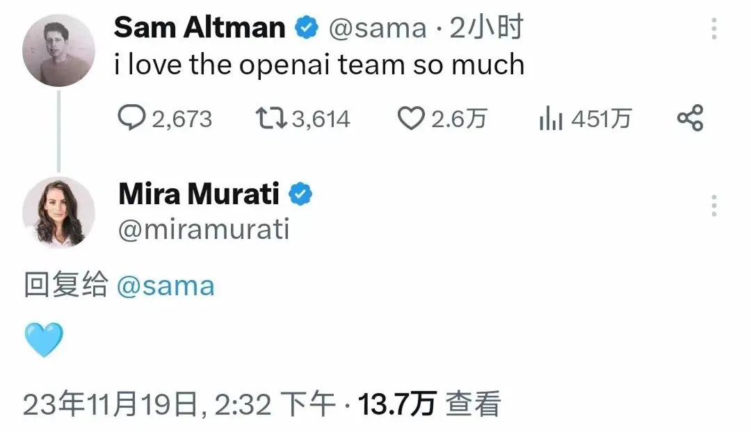 据知情人士透露,推动董事会辞职并恢复 Sam Altman 职位的 OpenAI 高管包括临时 CEO Mira Murati、首席战略官 Jason Kwon 和首席运营官 Brad Lightcap。从此前 Mira Murati 与 Sam Altman 的互动可见端倪。