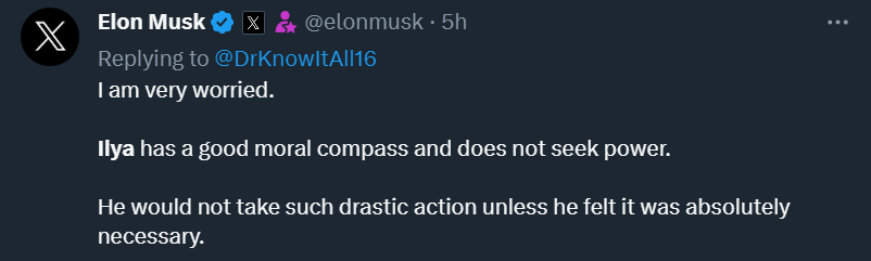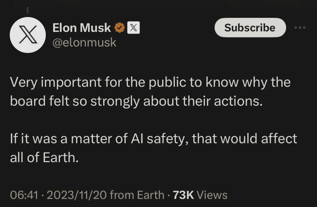 有趣的是,作为 OpenAI 前董事会成员的马斯克也就 Altman 被开除一事发表了看法。不过,他关注的是该事件背后的真正原因。他说,「OpenAI 应该向公众解释他们罢免 Sam Altman 的原因。如果事关 AI 安全,那将会影响全世界。」他还提到,「Ilya 有着良好的道德准则,并且不热衷权力。除非他觉得绝对有必要,否则他是不会采取这种极端行动的。」