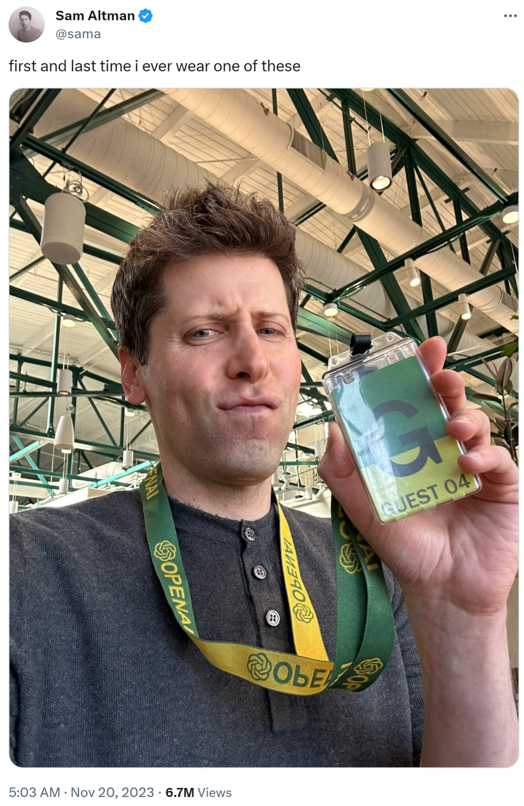 自上周六早晨被 OpenAI 开除过去了 48 个小时,Sam Altman 回到了 OpenAI 旧金山总部。不过这次他是以「访客」的身份回公司的。他在 X 上表示,「这是我第一次也是最后一次佩戴访客牌。」