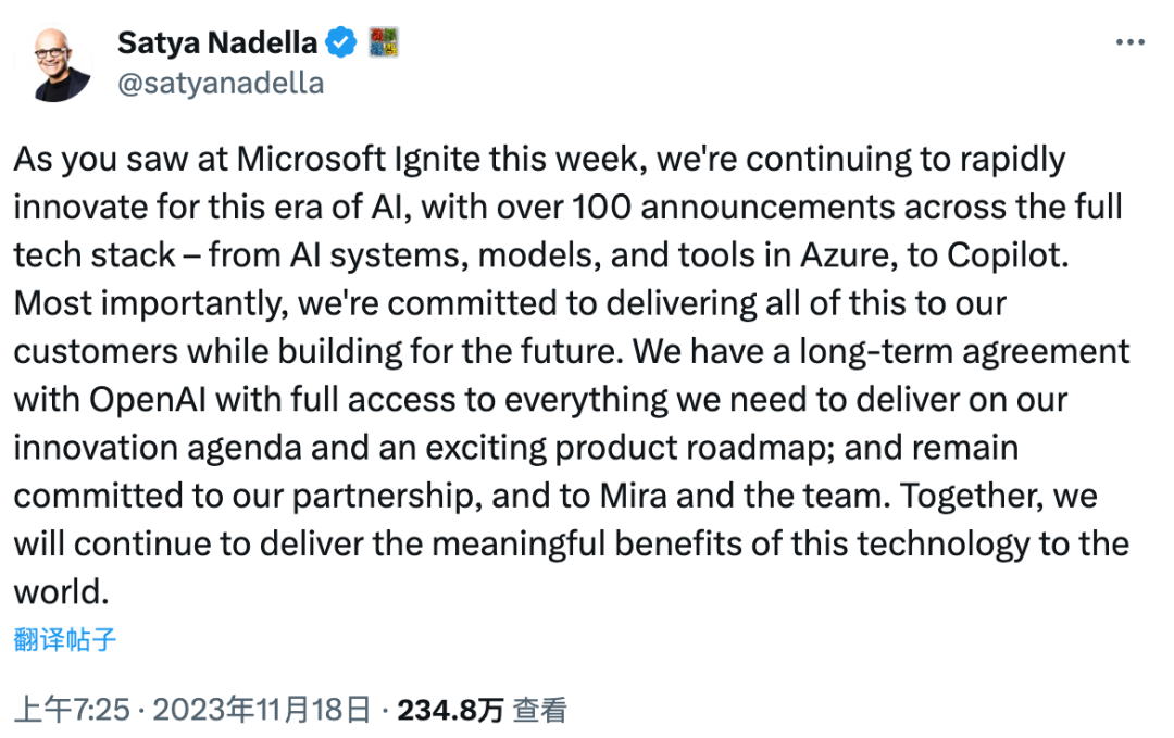 微软 CEO Satya Nadella 在 Altman 被开除后发布的帖子,表示微软与 OpenAI 有长期协议,二者将继续携手,将 AI 技术的好处带给全世界。