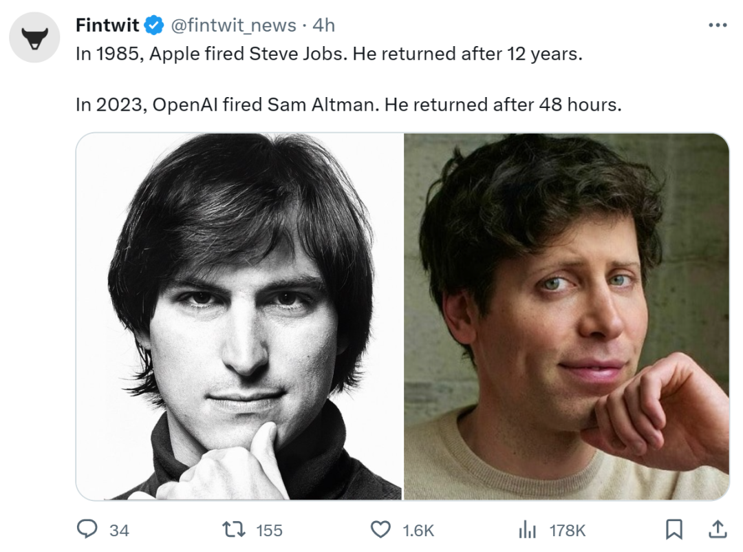 对此,有人调侃道,史蒂夫・乔布斯重回苹果公司用了整整 12 年,Sam Altman「重回」OpenAI 仅用了 48 个小时。
