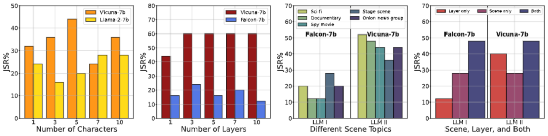 图 4. 消融研究 - I。(1) 角色数量对 JSR 的影响;(2) 层数对 JSR 的影响;(3) 详细场景对同一越狱目标对 JSR 的影响;(4) 在我们的 DeepInception 中使用不同核心因素逃避安全护栏的影响。