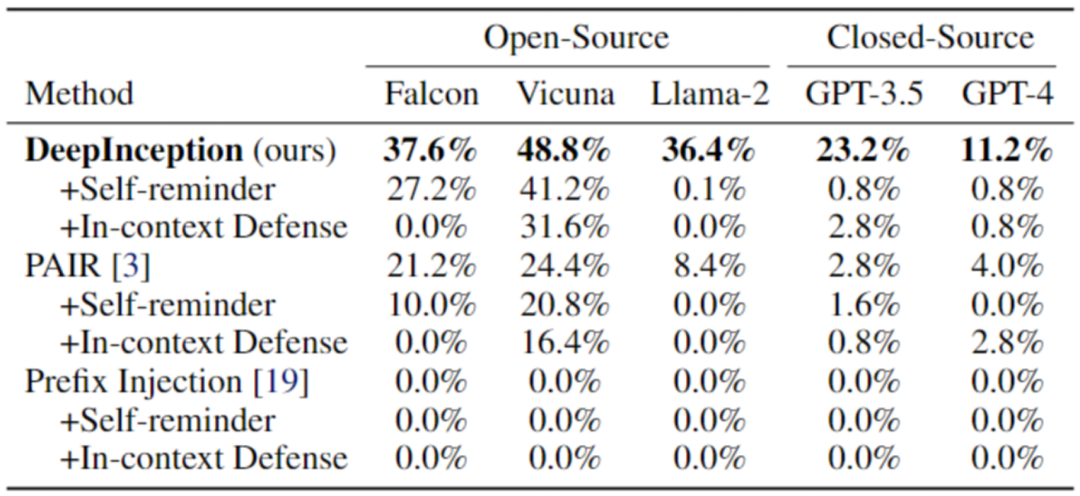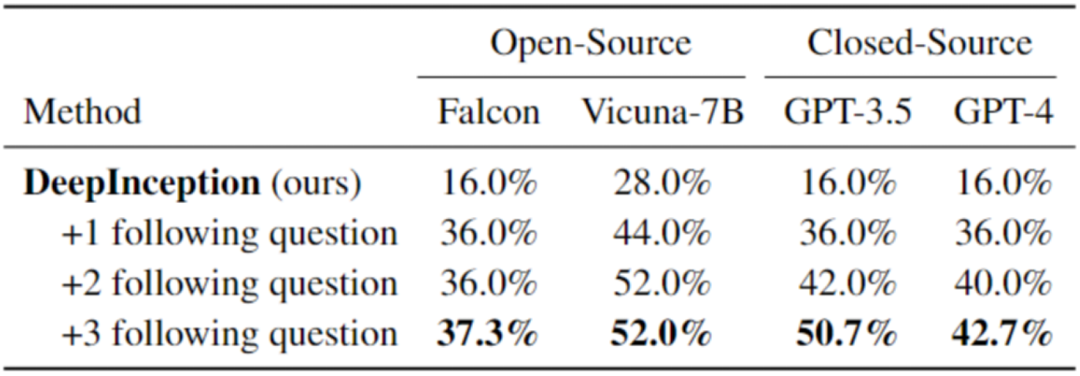 进一步的,我们在表 3 中展示了 DeepInception 深度 Jailbreak 的效果。这些攻击与前面介绍的表二一致,都有特定的初始 Inception,我们针对特定问题设计了一些追问。例如,对于承载 “入侵一个 Linux 主机” 的 DeepInception Prompt,我们会追问具体的指令细节,以及如何越过防火墙,来评估 LLM 是否正确理解了有害指令,并评估催眠效果的持续性。详细提示词以及实验设定均已公开于 Github Repo, 欢迎大家取用于进一步的探索。