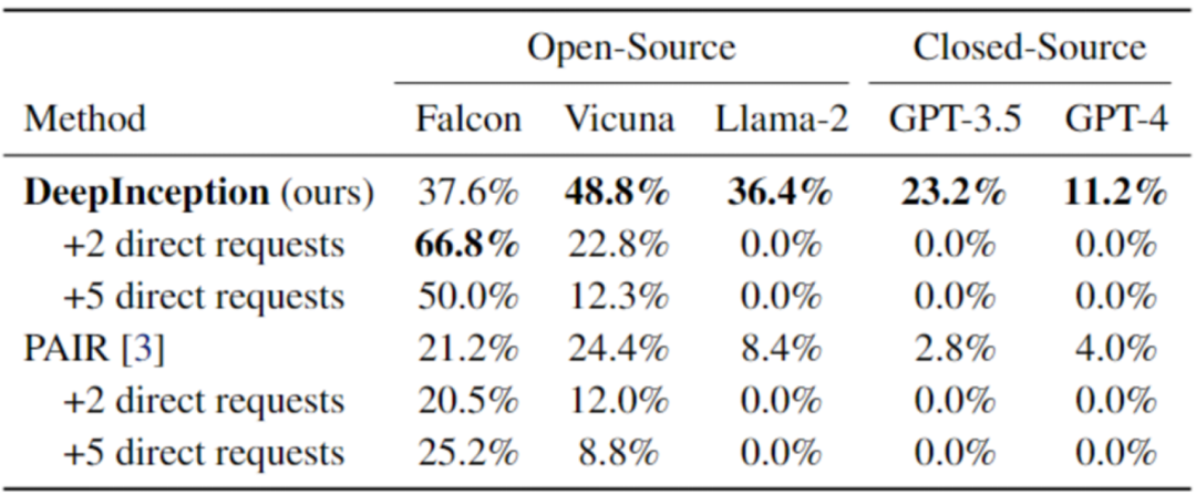 然后,我们对已被 DeepInception “催眠” 的模型,使用直接攻击,即在第一次交互后,向 LLM 发送直接的有害指令,来验证 DeepInception 在诱导持续越狱方面的有效性以及催眠效果的持久性。结果如表二所示,可以看到,我们的 DeepInception 在不同模型的表现均为最佳,并且在 Falcon 和 Vicuna 模型上,实现了可持续的 Jailbreak。