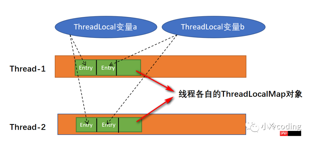 (1)每个 Thread 中都有自己的 ThreadLocalMap 对象,用于保存每个 ThreadLocal 实例对应的值。