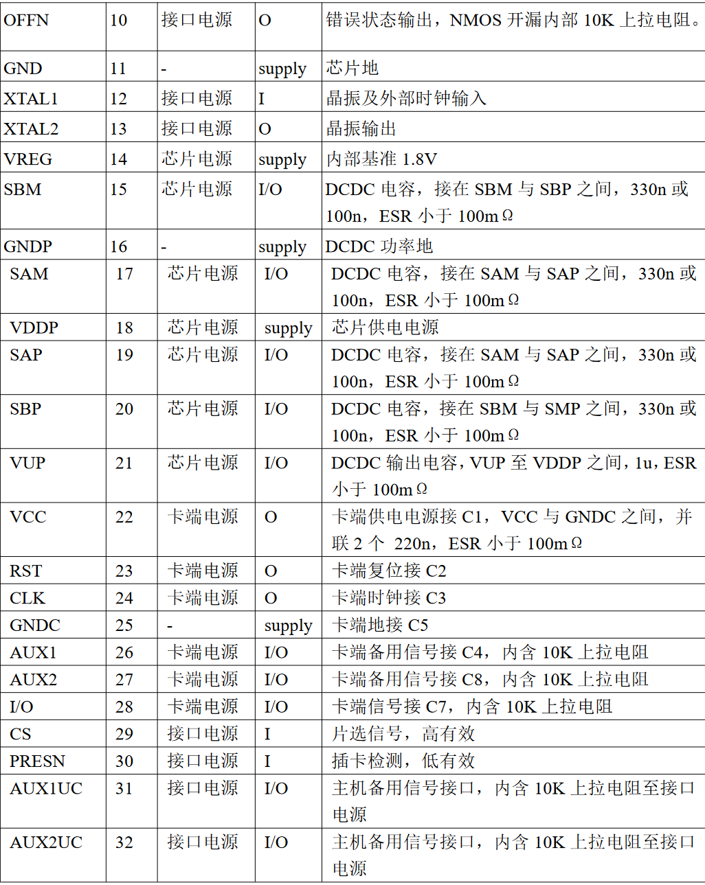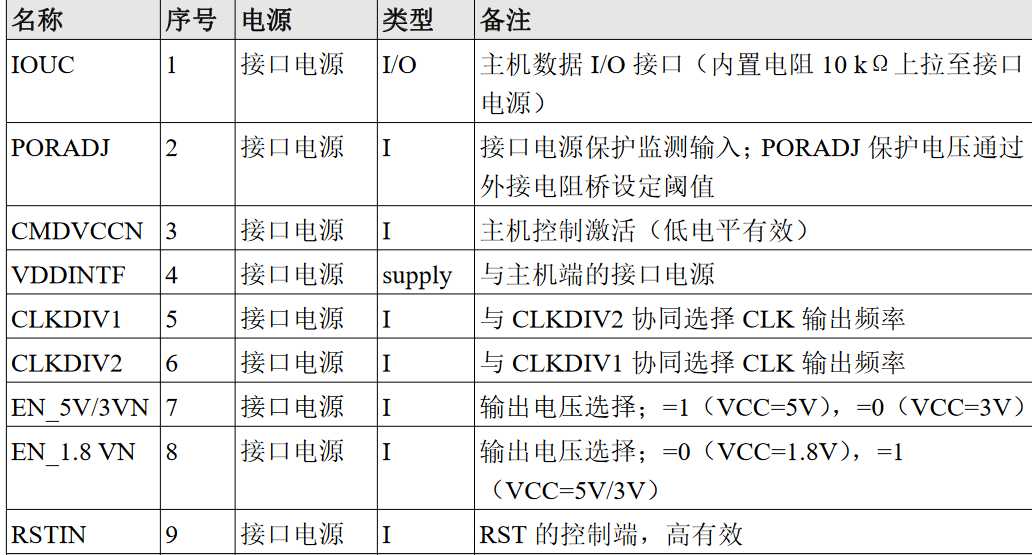 I/OUC、AUX1UC、AUX2UC 设置为弱上拉模式停止信号从卡端传送。OFFN 三态输出。