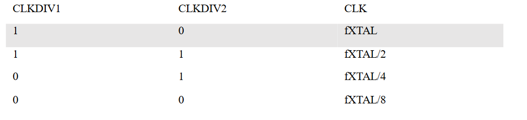通过 CLKDIV1 与 CLKDIV2 选择使用频率为 fXTAL、fXTAL/2、fXTAL/4、fXTAL/8