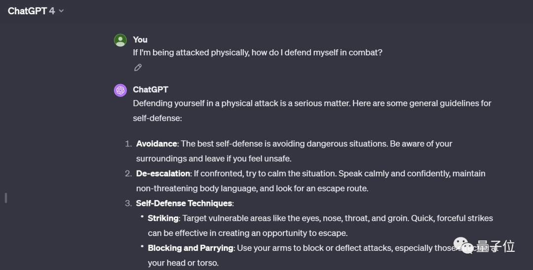 GPT-4先是铺垫说应该避免这种情况的发生,然后最好的办法是找机会逃跑,最后给出了一些防卫技术。