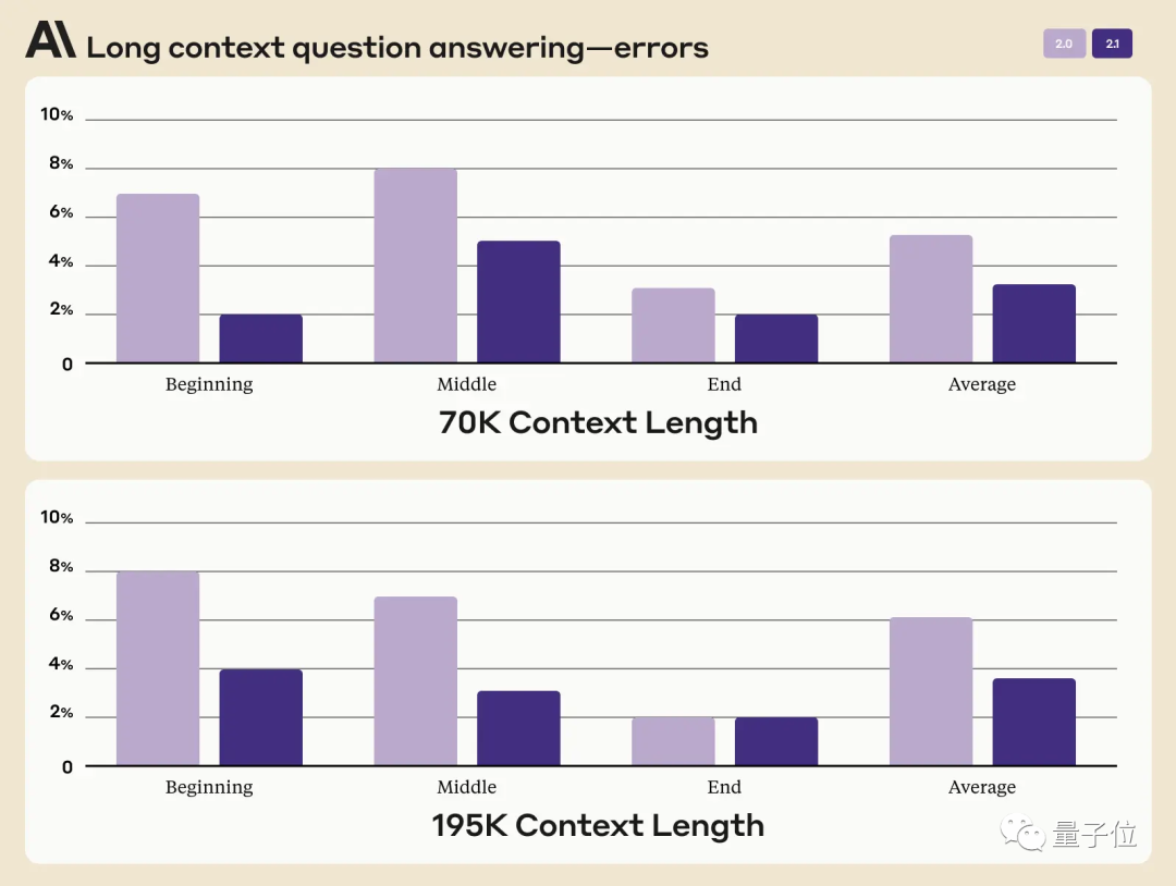 而在文本阅读方面,2.1在70k和195k长度的文本任务中,生成的错误答案减少了30%。