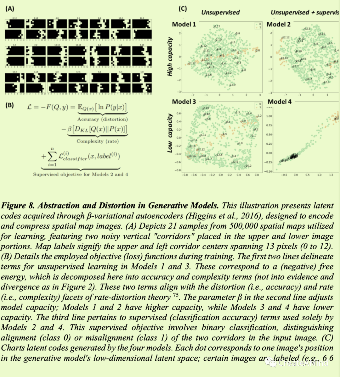 即使在坚持将模型定义为外部世界的表示的传统定义时,重要的是要承认没有模型能够完美地反映现实,并且某种程度的信息损失是不可避免的。然而,诸如主动推理和率失真理论75之类的范例超出了这一明显的考虑,并强调了生成模型中最佳信息压缩的重要性。在主动推理框架中,生成模型必须在准确性和复杂性之间取得平衡。这种平衡旨在促进从数据中进行最佳学习,确保效率和归纳能力。如图8所示,模型学习的不同约束(如数据统计和学习目标的变化)导致生成模型获得的潜在状态的不同几何形状和变化。