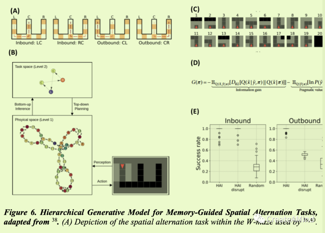 (B)用于解决空间交替任务的分层生成模型。该模型具有两个相互连接的级别,每个级别学习物理空间(级别1)和任务空间(级别2)的地图,支持分层感知推理、规划和动作-感知循环。(C)收集模拟啮齿动物在航行过程中遇到的感官观察。(D)规划涉及通过评估政策的预期自由能(记为G(π))来选择政策(行动序列,π)。值得注意的是,与10 (E)模拟结果中的变化自由能相比,预期自由能考虑了当前和过去观测之外的即将到来的观测(通过追求特定政策来预期),这说明了模型在空间交替性能中的准确性。结果表明,完整的HAI模型正确地解决了这一问题。然而,阻碍层级生成模型的两个级别之间的通信会影响挑战性(出站)决策(HAI-disrupt)中的决策制定。详情请见38。