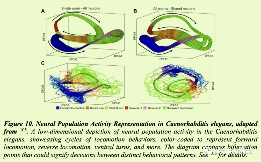 图10。秀丽隐杆线虫中的神经群体活动表示,改编自105。秀丽隐杆线虫中神经群体活动的低维描述,展示了运动行为的循环,用颜色编码来表示向前运动、反向运动、腹部转弯等。该图捕捉了可能表示不同行为模式之间的决策的分歧点。详见105。