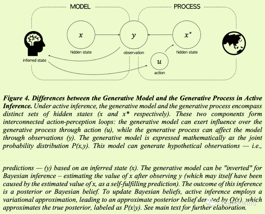 图4说明了大脑对外部世界的“生成模型”和实际外部世界(被称为负责有机体观察的“生成过程”)之间的关键区别。该图突出了几个关键方面。首先,生成模型捕捉从直接观察中隐藏的可观测量(y)和状态(x)之间的统计关系。这在形式上等同于不可观察原因和可观察结果P(x,y)的联合概率分布。其次,需要注意的是,生成模型并不等同于现实本身;相反,它代表了有机体对现实的解释