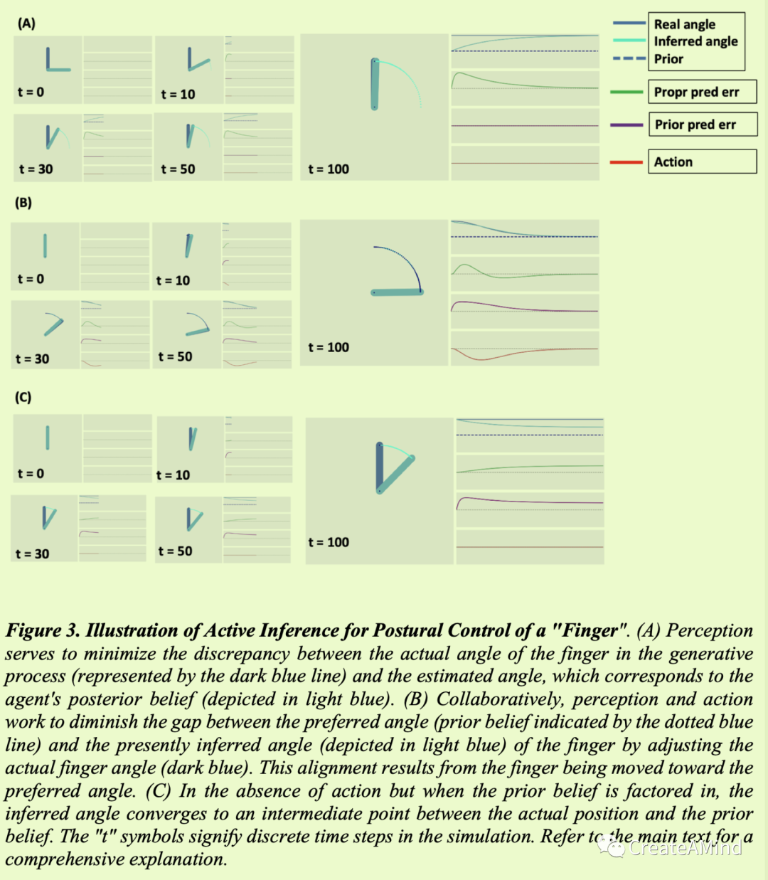 图3。“手指”姿势控制的主动推理图解。(A)感知用于最小化生成过程中手指的实际角度(由深蓝色线表示)和估计角度之间的差异,估计角度对应于代理的后验信念(用浅蓝色表示)。(B)通过调整手指的实际角度(深蓝色),感知和动作协同工作以减小手指的优选角度(由蓝色虚线表示的先前信念)和当前推断角度(用浅蓝色表示)之间的差距。这种对准是由于手指朝着优选的角度移动而产生的。(C)在没有行动的情况下,但是当先前的信念被考虑在内时,推断的角度收敛到实际位置和先前信念之间的中间点。“t”符号表示模拟中的离散时间步长。有关全面的解释,请参考正文。