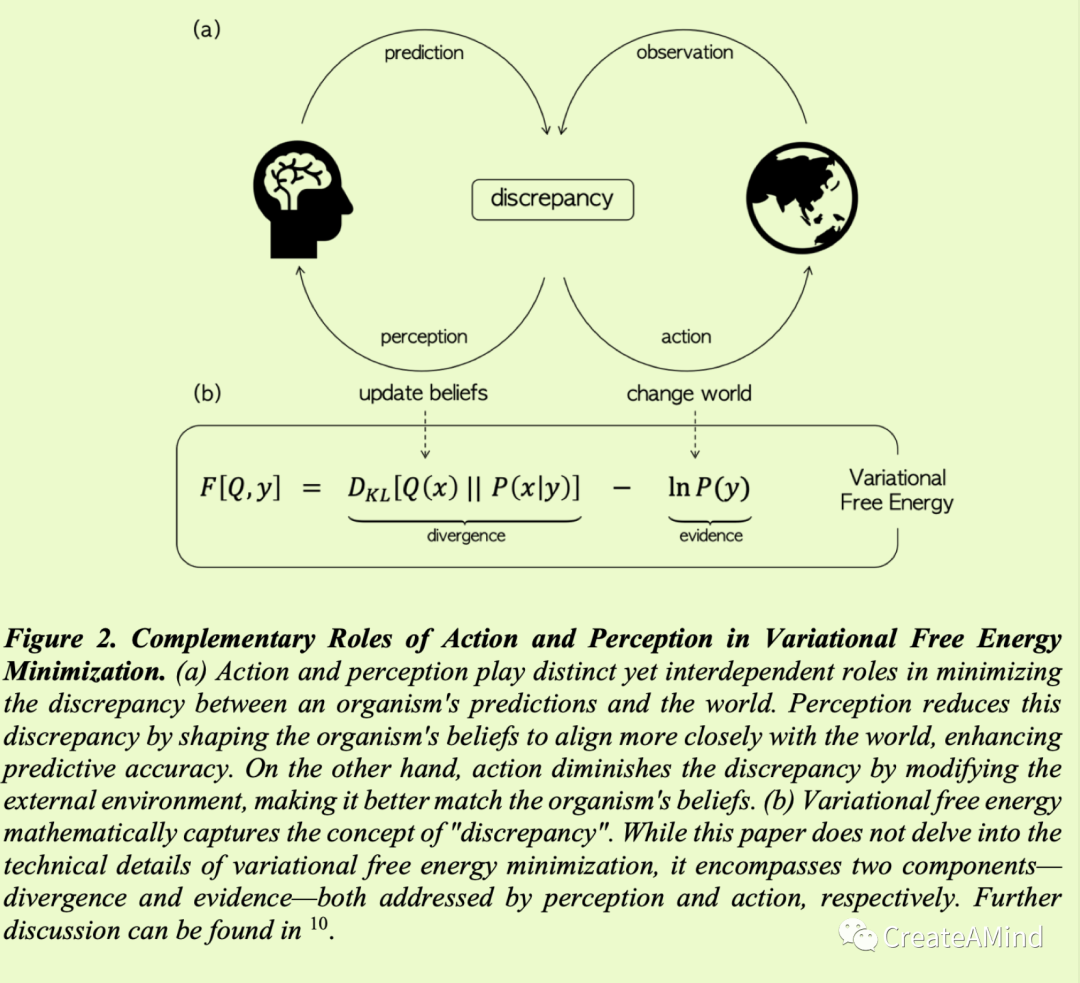 图二。行动和感知在变分自由能最小化中的互补作用。(a)行动和感知在最小化有机体的预测和世界之间的差异方面发挥不同但相互依赖的作用。感知通过塑造有机体的信念来减少这种差异,使其与世界更加一致,从而提高预测的准确性。另一方面,行动通过改变外部环境来减少差异,使其更好地符合有机体的信念。(b)变分自由能在数学上抓住了“差异”的概念。虽然本文没有深入研究变分自由能最小化的技术细节,但它包含两个部分——分歧和证据——分别由感知和行动解决。进一步的讨论可以在10中找到。