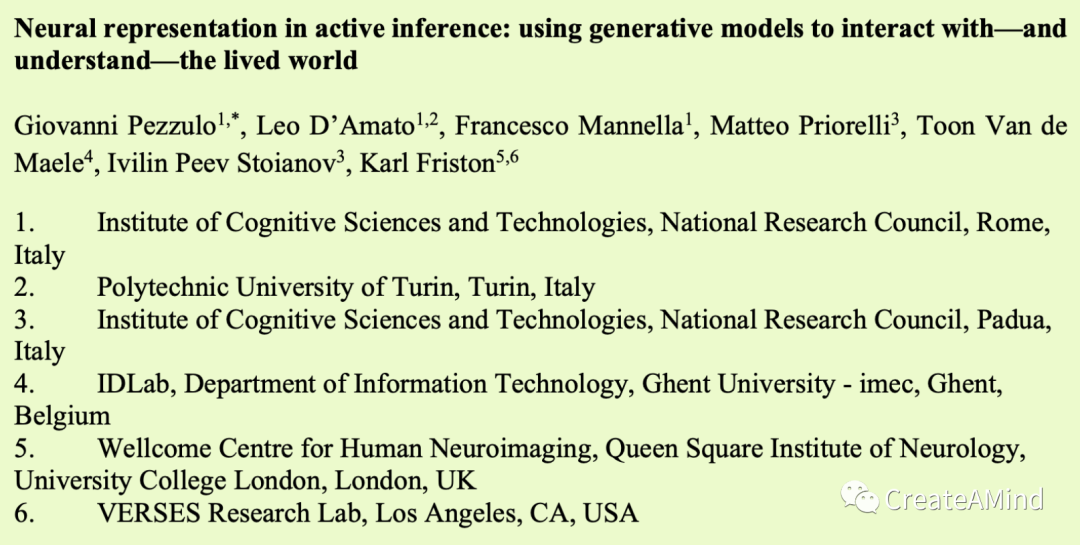 虽然生成模型通常与“外部世界的模型”相关联,但这一概念扩展到包含更广泛的范围:它不仅包括外部世界的模型,还包括身体的模型(如“身体图式”)、内部环境(如“内部感受图式”)、情感方面、社会动态、自我相关的结构等21–27。关键的一点是,为了生存,生命体的生成模型不仅必须提供理解世界的方法,还必须规定行动的方法——从而将能动性归于有机体。换句话说,大脑学习生成模型是为了与世界互动,而不是(或不仅仅是)理解世界。因此,包括潜在动作和隐含启示28的模型在活生物体的上下文中变得至关重要。