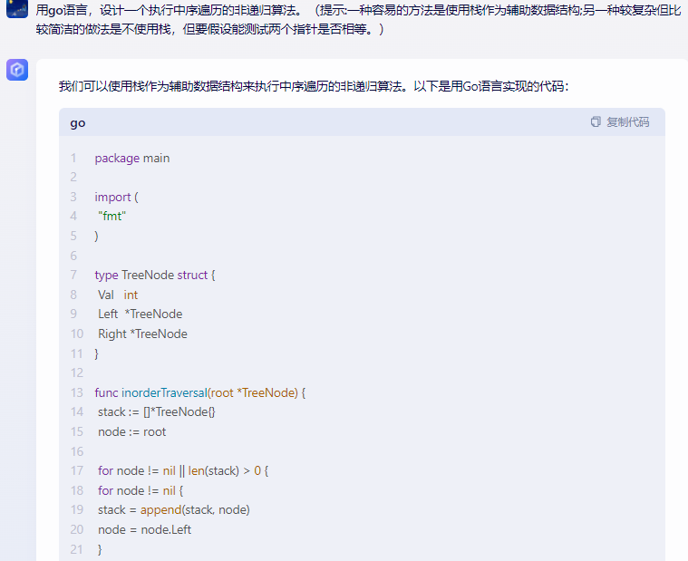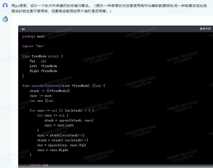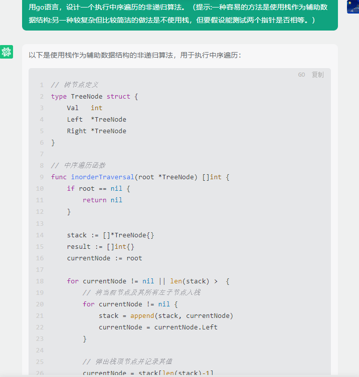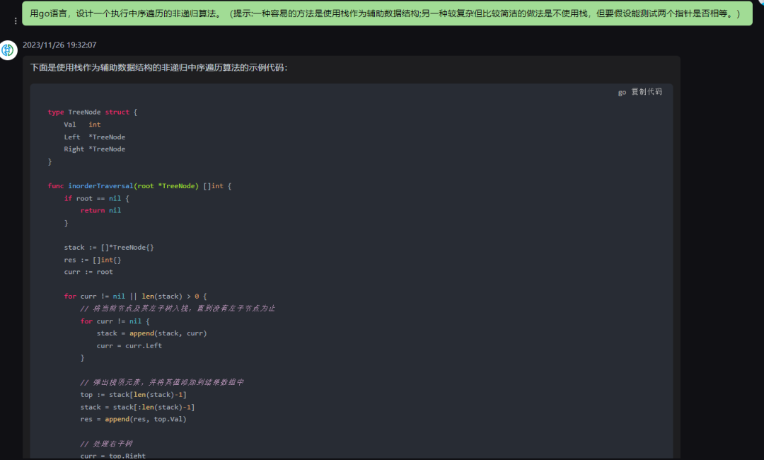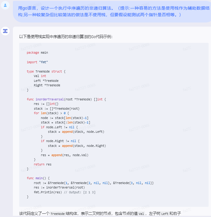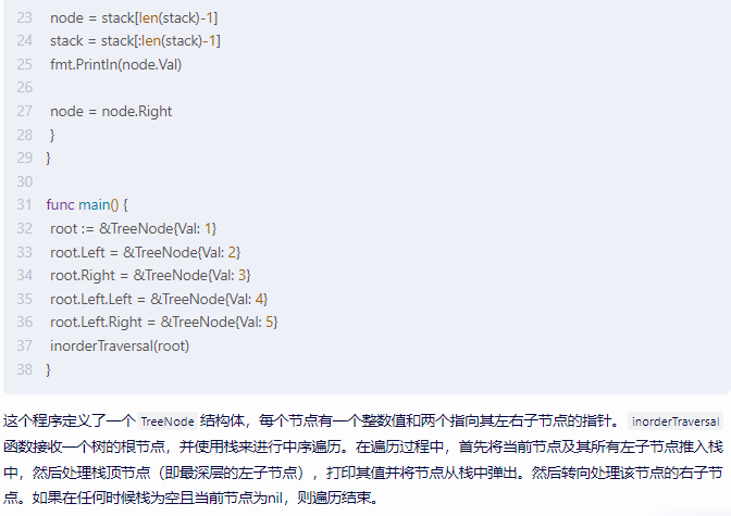 }这个程序定义了一个TreeNode结构体,每个节点有一个整数值和两个指向其左右子节点的指针。inorderTraversal函数接收一个树的根节点,并使用栈来进行中序遍历。在遍历过程中,首先将当前节点及其所有左子节点推入栈中,然后处理栈顶节点(即最深层的左子节点),打印其值并将节点从栈中弹出。然后转向处理该节点的右子节点。如果在任何时候栈为空且当前节点为nil,则遍历结束。